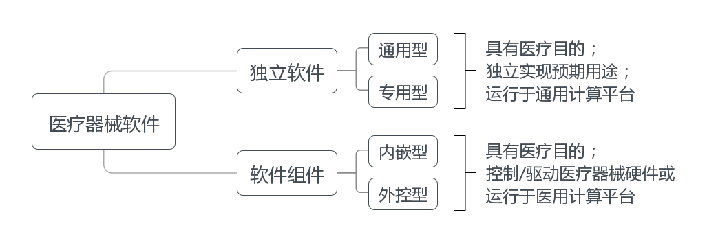 醫療器械軟件包括本身即為醫療器械的軟件或者醫療器械內含的軟件,前者即醫療器械獨立軟件(簡稱獨立軟件),后者即醫療器械軟件組件(簡稱軟件組件)。 獨立軟件(SaMD)是指具有一個或多個醫療目的/用途,無需醫療器械硬件即可完成自身預期用途,運行于通用計算平臺的軟件;軟件組件(SiMD)是指具有一個或多個醫療目的/用途,控制/驅動醫療器械硬件或運行于醫用計算平臺的軟件。 獨立軟件作為醫療器械或醫療器械附件,通常單獨注冊,特殊情況可隨醫療器械進行注冊,此時雖不控制/驅動醫療器械硬件但從產品角度運行于醫用計算平臺,故視為軟件組件,如專用型獨立軟件可作為附件隨醫療器械進行注冊。 軟件組件作為醫療器械或醫療器械部件、附件的組成部分,不宜單獨注冊,需隨醫療器械進行整體注冊。